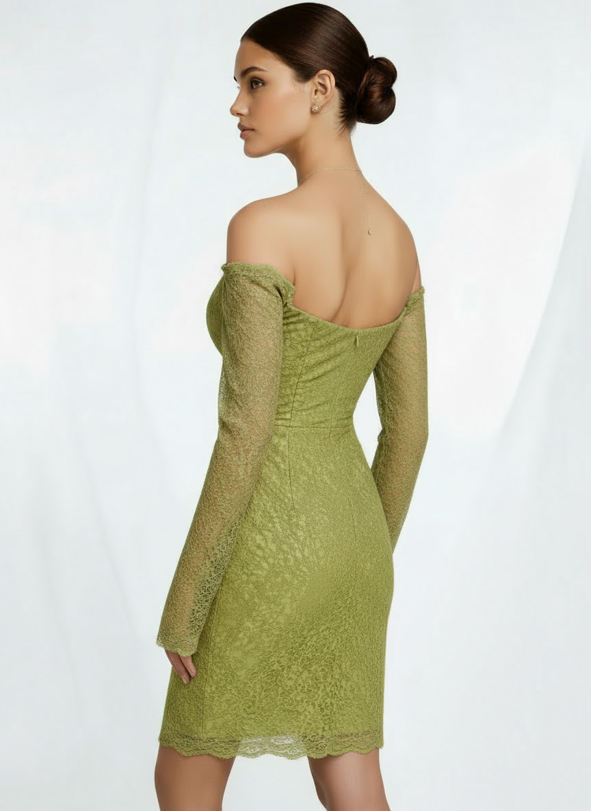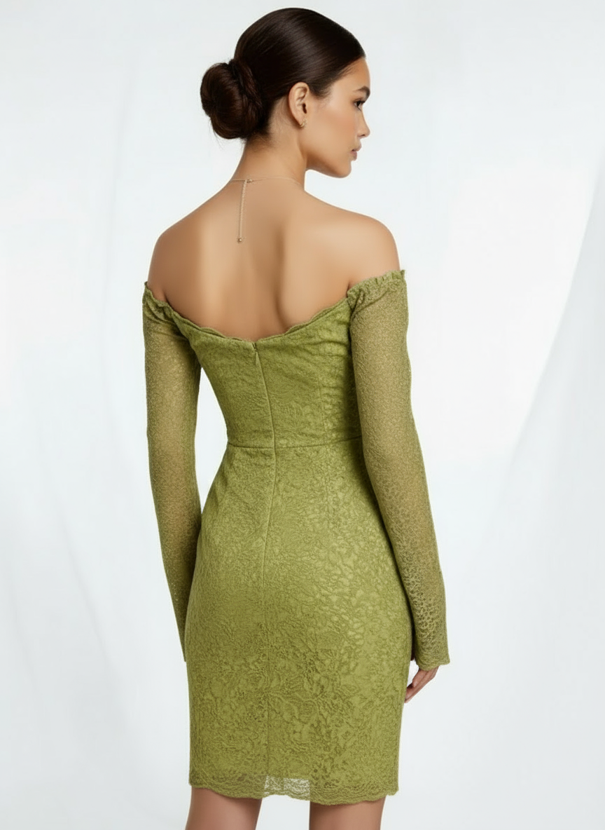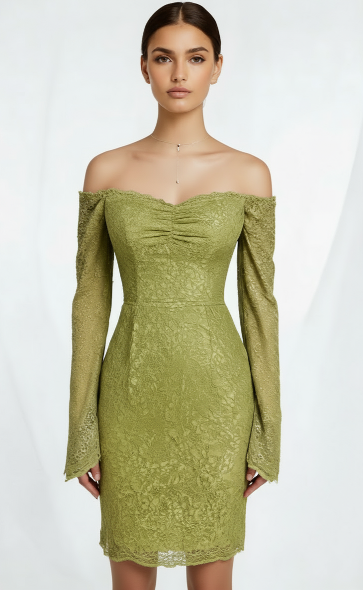 A sage-colored dress with an off-the-shoulder cut and long sleeves.
