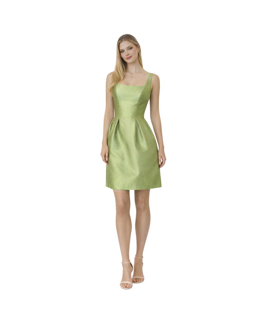Ein elegantes Satinkleid in Salbeifarbe mit leicht ausgestellter Silhouette.